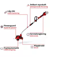Med Einhell GE-CT 36/30 Li E - Solo sladdlös grästrimmer har hobbyträdgårdsmästaren en praktisk och beprövad hjälp i redskapsboden. Oavsett om det gäller trimning av kanter eller forma hemmets gröna, den sladdlösa grästrimmern arbetar tack vare elektronisk varvtalsreglering snyggt och effektivt. Den ingår i den beprövade Power X-Change-familjen. Batterier kan användas i alla apparater i denna systemserie. För drift av den sladdlösa grästrimmern krävs 2x 18 V batterier. Det vinklade aluminium-styrskaftet ger arbete man inte blir trött av. Tack vare split-skaftet är transporten enkel och apparaten är smidig att förvara. Det justerbara extrahandtaget är utrustat med en snabblåsning. Tråden matas fram via tryckautomatik. och ger en klippbredd på upp till 30 centimeter. Utrustning som bärrem, vägghållare och softgrip gör den sladdlösa grästrimmern till en mångsidig och bekväm hjälp i trädgården. Flowerguard garanterar alltid erforderligt säkerhetsavstånd till blommor och plantor och ger därmed en vacker trädgård. Levereras utan batterier och laddare. Dessa kan köpas separat.