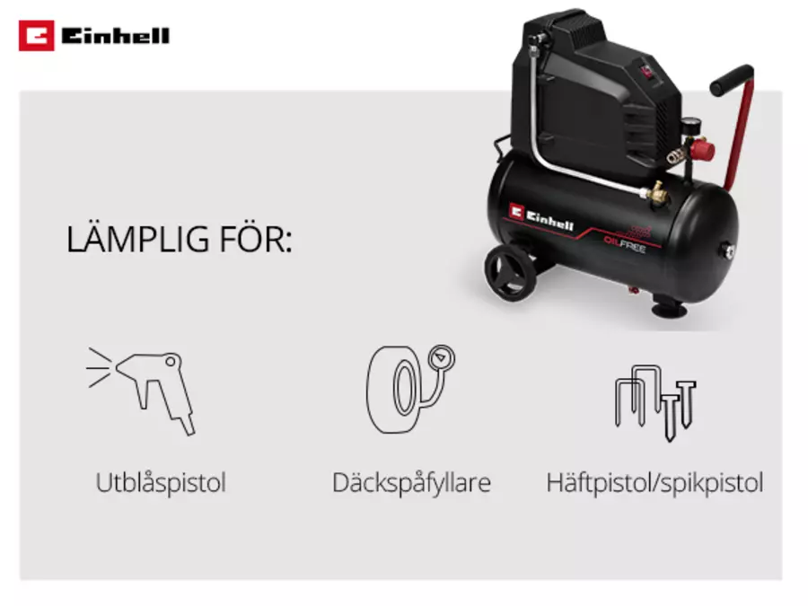 Einhell kompressor TC-AC 190/24/8 I OF är en effektiv och mångsidig kompressor som lämpar sig optimalt för hemmafixare. Tack vare den robusta induktionsmotorn med en effekt på 1 100 Watt ger den konstant prestanda även vid intensiv användning. Den oljefria pumpen kräver minimalt underhåll och ger en sugeffekt på 190 l/min. Effekten är 75 l/min vid 4 bar. Detta gör kompressorn särskilt attraktiv för användning i garage eller verkstäder. Med den integrerade tryckreducerventilen kan arbetstrycket ställas in exakt upp till ett maximalt värde på 8 bar. För övervakning av arbetstrycket finns en manometer som är lätt att läsa av, vilket möjliggör en exakt kontroll och anpassning, för att uppnå optimala arbetsresultat. Vidare sörjer den vibrationsdämpade foten för en säkerhet och stabilitet under driften, även vid längre användningstider. Dessutom underlättar det praktiska bärhandtaget och de stabila hjulen transporten av kompressorn, så att den kan användas flexibelt på olika användningsplatser. Med en garanti på 10 år mot att tanken genomrostar ger Einhell kompressor TC-AC 190/24/8 I OF en särskilt lång livslängd och är därmed ett tillförlitligt val för många projekt.