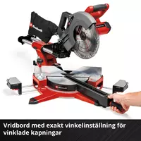 Den sladdlösa drag-kap-geringssågen Einhell TE-SM 36/10 L Li-Solo kan användas för arbeten i trä, för geringskapning, kapning eller sågning av parkett. Den sladdlösa versionen av sågen ger obegränsad användningsradie: inga störande kablar vid arbetet, ingen upplindning efter arbetet. Som medlem i Power X-Change-familjen kan alla batterier i den effektstarka litiumjon-serien kombineras med drag-kap-geringssågen. För optimala resultat rekommenderas minst ett 2,5 Ah Plus-batteri i PXC-serien. Det kan köpas separat. Den sladdlösa drag-kap-geringssågen från Einhell är utrustad med en lättgående dragfunktion som också lämpar sig för bredare arbetsstycken. X-Tend-bord för arbetsstycken kan justeras med en hand och utan verktyg. Fastspänningsanordningen används för säker fixering av arbetsstycket. Vridbordet har en exakt vinkelinställning för vinklade kapningar. Dessutom kan såghuvudet vinklas upp till 45° åt vänster för geringskapning. Den effektstarka sågen är utrustad med en högkvalitativ HW-precisionssågklinga som ger en fin kapningsbild. Kaplinje-lasern och LED-belysningen ger snabba, exakta och dessutom säkra kapningar. Dessutom har den sladdlösa drag-kap-geringssågen en spånpåse eller en adapter för dammsugare för att hålla arbetsplatsen och luften ren.
